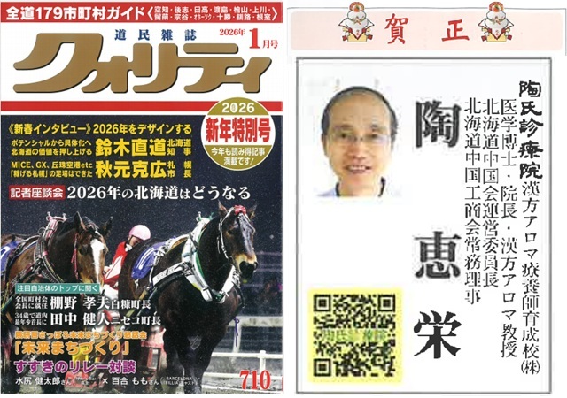 『道民雑誌クォリティ』2026年新年特別号の賀正特集には、陶氏診療院の名刺紹介を掲載していただきました。毎年の恒例ではありますが、新年らしい晴れやかな気分を感じることができました。