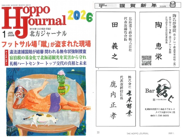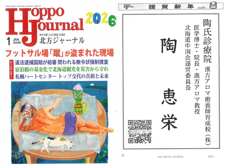 また今年は、お世話になっている北方ジャーナル雑誌社の「恭賀新年特集」にも、当診療院の名刺広告を掲載していただき、心より感謝しております。北海道中国会・北海道中国工商会の仲間である田義之様、鹿内正孝様、Bar紡ぐ(申恩哲様)の名刺広告も拝見し、つながりの大切さを改めて感じました。