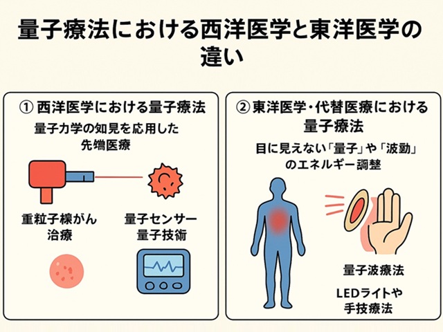 量子療法は、その考え方と応用範囲によって、大きく「西洋医学的量子療法」と「東洋医学的量子療法(代替・エネルギー医療)」の二つに分けられます。