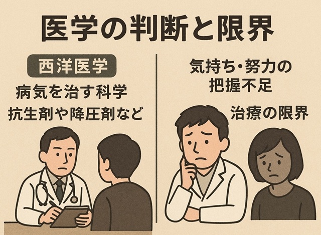 西洋医学は「病気を治す科学」として発展し、抗生剤や降圧剤など、経験的にも確立した治療法を多く持っています。これらの疾患では治療の見通しが立ちやすく、医師の判断も明確で、治療の参考価値が高いといえるでしょう。