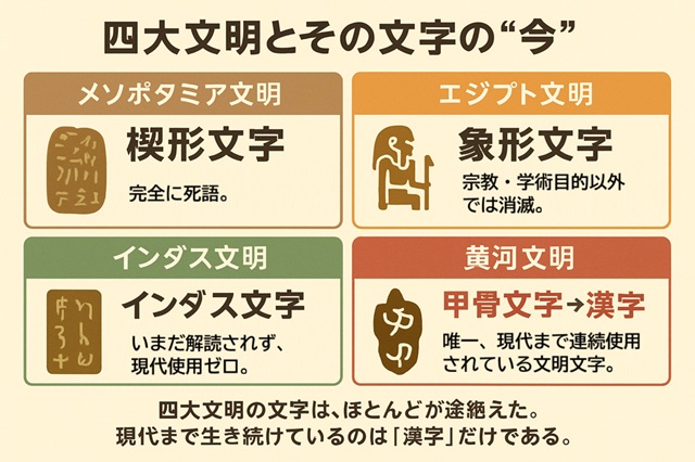 現代まで生き続けているのは「漢字」だけである。これは単なる文字の話ではなく、文明・哲学・思考法そのものが残ったということ。