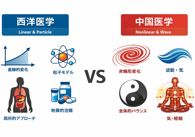 人体は本来、極めて複雑なシステムであり、単純な古典物理学的発想のみでは十分に理解することは困難です。その発想を基盤として発展してきた西洋医学が、人体の多様で動的な変化すべてに対応しきれないのは、ある意味で必然とも言えます。