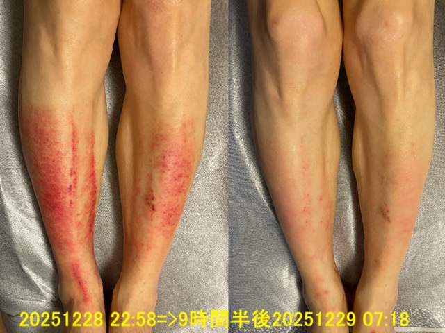 先日、自分の痒みが出ている足に対して、約1時間かけて丁寧にカッサを行いました。その結果、痒みはすっきりと取れ、久しぶりにぐっすり眠ることができました。翌朝、写真を撮って確認すると、カッサ後に赤く現れていた瘀血も、かなりきれいになっていました。