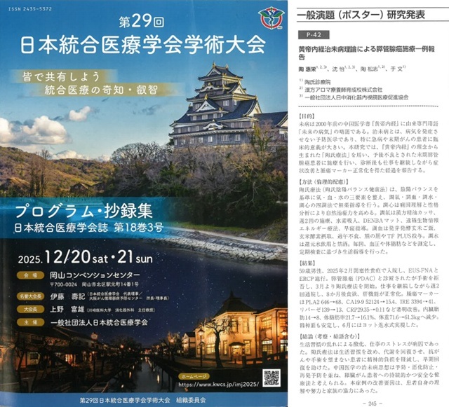 私の発表では、中国医学の**「治未病」の視点から、直近の学会で報告した2症例に加え、これまでに経験してきた腫瘍患者の症例を紹介し、中国医学が持つ先見性と先端性**をお伝えします。