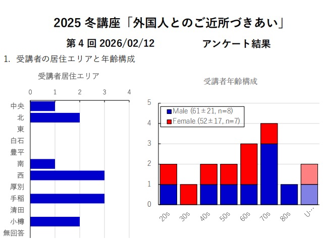【ちえりあ学習ボランティア企画講座】「外国人とのご近所づきあい~私たちにとって共生社会とは~」の第4回講座に登壇しました。2月12日、私の担当は「札幌の地に生かされて―中国医学から市民健康への貢献」。本シリーズの締めくくりとして、外国人が地域社会にどのような形で貢献してきたか、そして私自身が中国医学を通じて歩んできた道についてお話ししました。