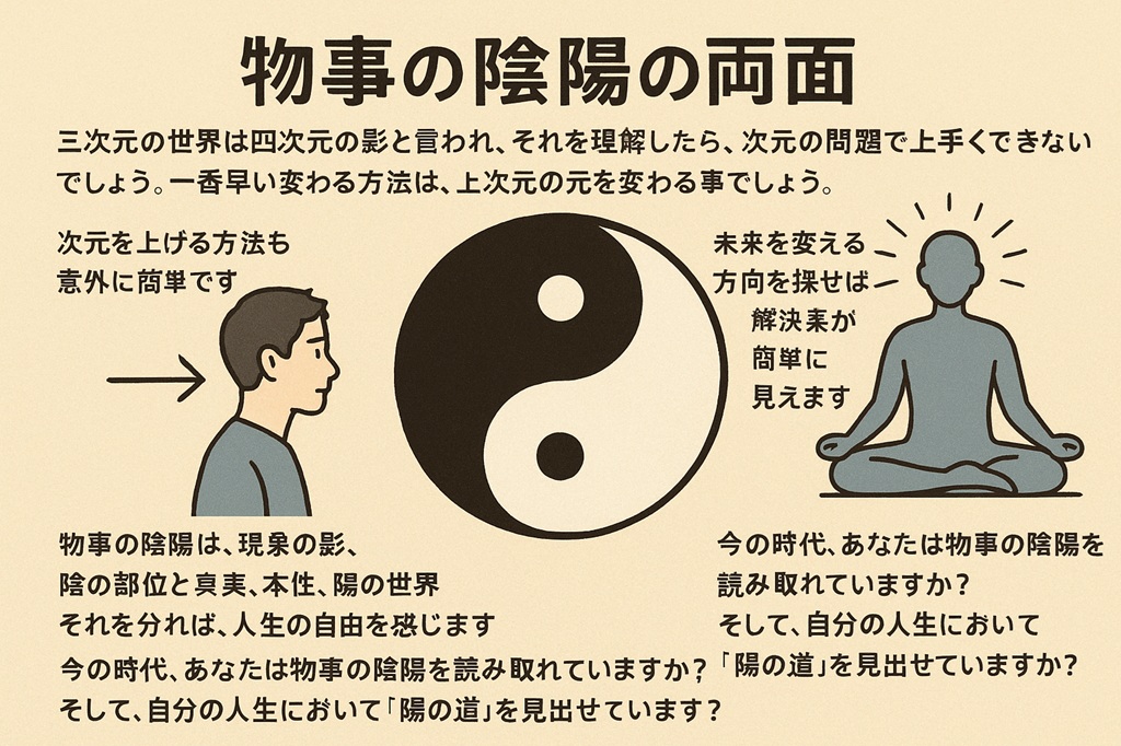 物事の陰陽とは、現象として現れる「影=陰」の側面と、真実・本質である「陽」の側面です。これを理解すれば、人生において本当の自由を感じられるようになります。