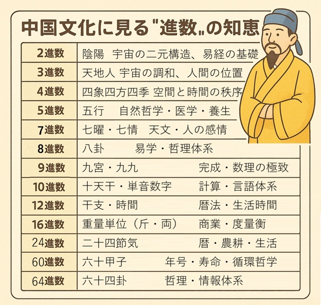 進数の多様さは、中国文化の奥深さと、自然と人間を一体として捉える叡智の象徴と言えるでしょう。