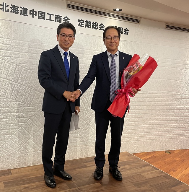 中華人民共和国駐札幌総領事館の総領事からは来賓挨拶祝辞があり、北海道華僑華人の活動、特に工商会の着実な発展に感謝の意が示されました。今後はより多くの日本人の方々も巻き込みながら、北海道と中国の経済・文化交流をさらに深めていきたいとの期待が述べられました。続いて、北海道日中友好協会の城信隆会長による乾杯のご発声で懇親会が始まりました。
