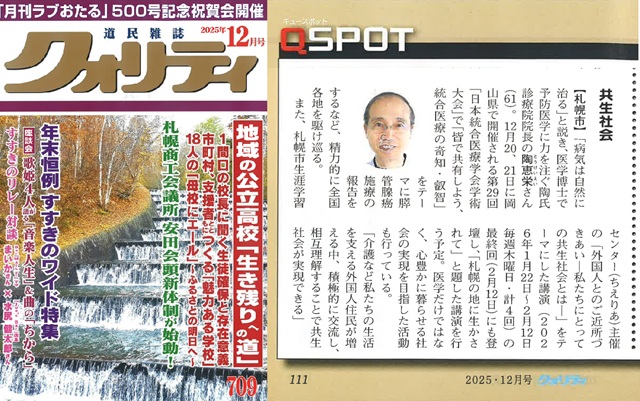 道民雑誌クォリティ2025年12月号の「QSPOTキュースポット」(P110)に、陶氏診療院院長陶恵栄の記事を掲載しました。紹介します。