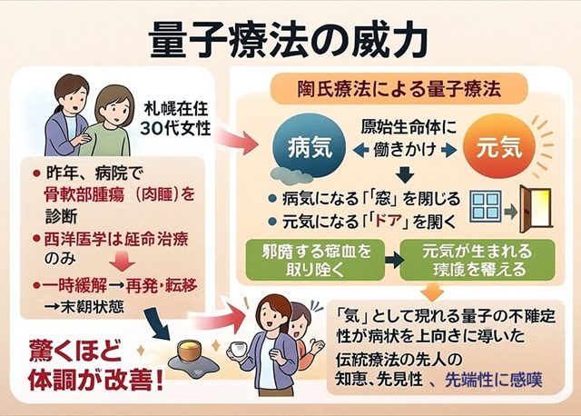 私の診療院では、量子療法によるこうした変化は決して珍しいものではなく、私自身は慣れています。しかし、初めて見る方にとっては驚きが大きく、その気持ちはよく理解できます。「氣」とは、量子の不確定性そのものであり、施療によって人々の想像を超える変化として現れます。とくに中国伝統療法を正しく行うことで、身体を良い方向へ導くその力には、私自身も日々、先人の知恵・先見性・先端性に改めて驚かされています。