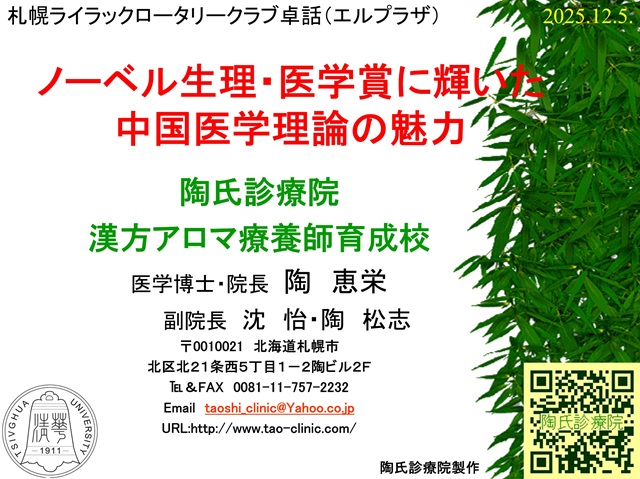 12月5日、札幌ライラックロータリークラブ例会にて「ノーベル生理・医学賞に輝いた中国医学理論の魅力」というテーマで卓話をさせていただきました。