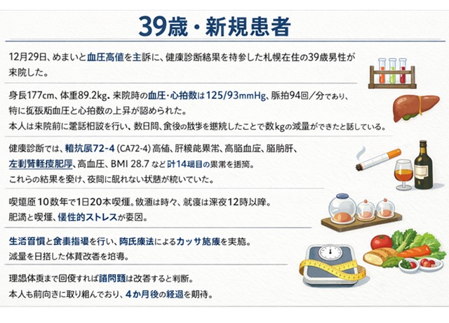 12月29日、めまいと血圧高値を主訴に、健康診断結果を持参した札幌在住の39歳男性が来院した。