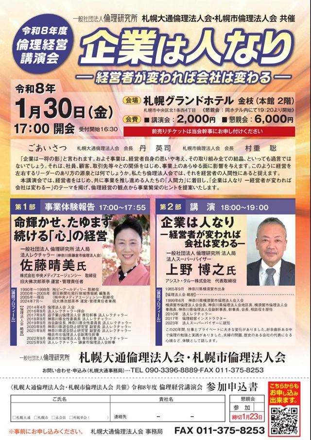 私が参加している倫理法人会でも、こうした法則・規則の学びを毎週行い、多くの成功体験を共有しています。今月30日には、札幌市倫理法人会と大通倫理法人会の共催による「令和8年度 倫理経営講演会」が開催されます。