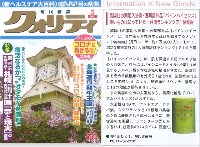 道民雑誌クォリティ2021年5月号インフォメーション×ニューグッズ特集で、陶氏診療院推薦する入浴剤を紹介しました。