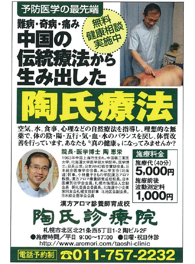 今年書店販売する、ホームドクター保存版に陶氏診療院の紹介が「予防医学最先端」として、掲載されてます。参考にしてください。