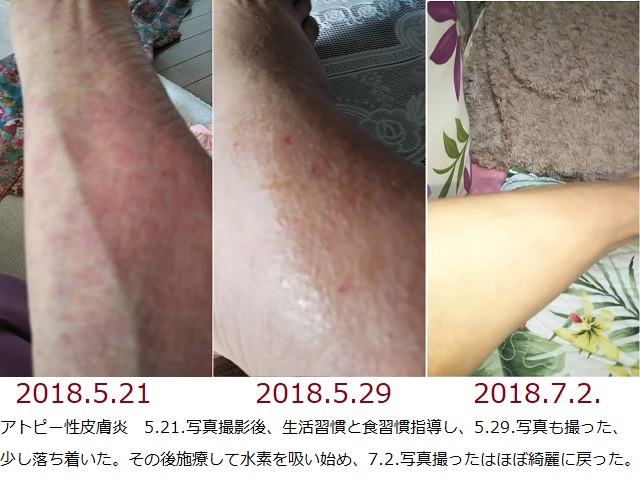 写真説明:アトピー性皮膚炎 5.21.写真撮影後、生活習慣と食習慣指導し、5.29.写真も撮った、少し落ち着いた。その後、施療して、水素を吸い始め、7.2.の写真はほぼ綺麗に戻った。
