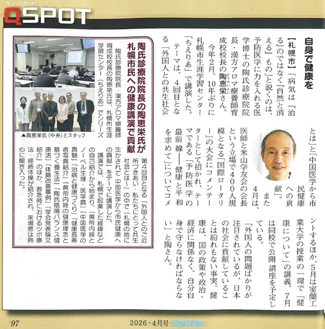 道民雑誌クォリティ2026年4月号QSPOT(P97)に、陶氏診療院陶恵栄医学博士講演記事を掲載しました。紹介します。