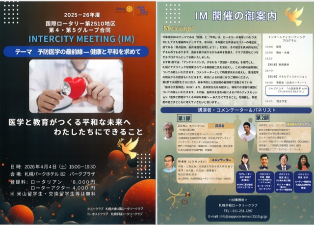 2026年4月4日、札幌パークホテル地下2階パークプラザにて、国際ロータリー第2510地区第4・第5グループ合同 INTERCITY MEETING(IM)テーマは、「予防医学の最前線―健康と平和を求めて、医学と教育がつくる平和な未来へ 私たちにできること」